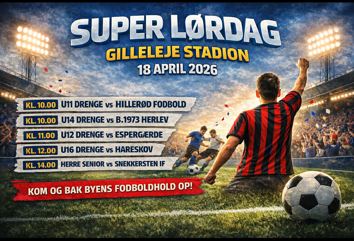 På lørdag d. 18-04-2026, byder Gilleleje stadion på hele 5 fodboldkampe, fordelt over hele dagen. Kom ned og se en masse god fodbold, og støt vores lokale fodboldhold.